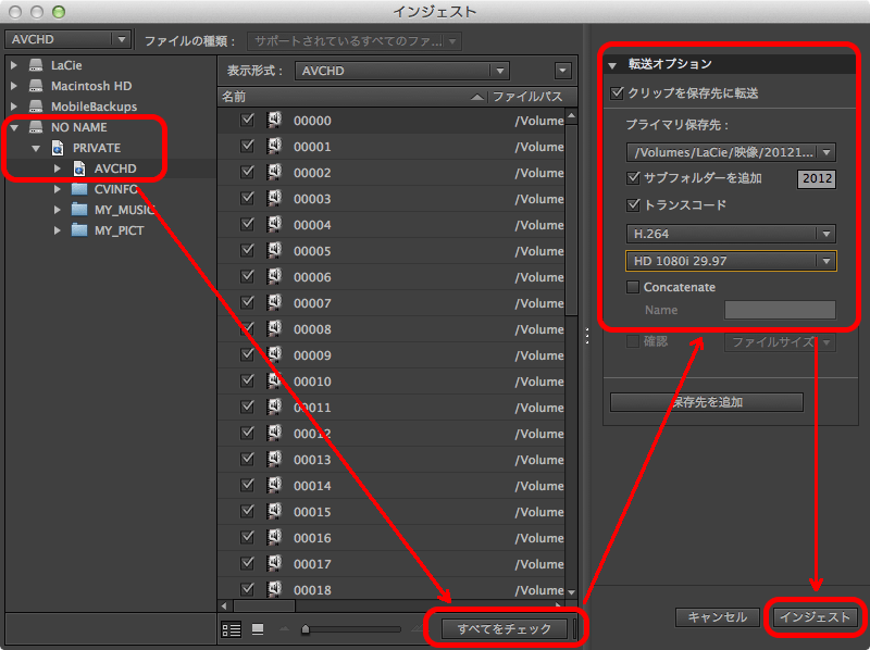 変換したいAVCHDファイルを指定します。写真はSDカード→PRIVATE→AVCHDと進んだ例です。で、変換したいファイルにチェックを入れます。まるっと変換する場合は「すべてをチェック」でOK。