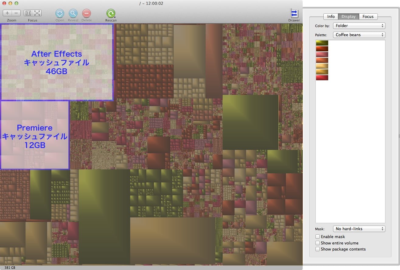 また、映像制作だけではなく、容量少なめになりがちなSSDモデルのかたは、冒頭で出てきたGrandPerspectiveを使って、なにがどれぐらい容量を食っているのかを調べるのもいいですね。