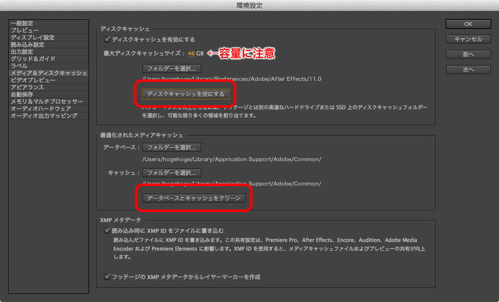 Premiere ProやAfter Effectsのキャッシュファイルを消去する